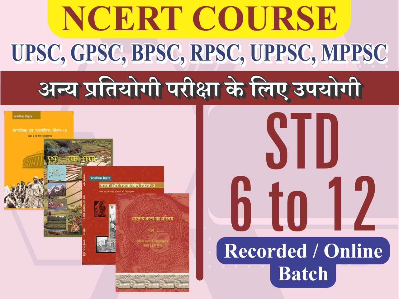NCERT कोर्स कक्षा 6 से तक 12 एडमिशन आरंभ : # फीस : ₹ 3999/- # मोड : रिकॉर्डेड ऑनलाइन # कुल कक्षाएं : लगभग 800+ # कोर्स की कुल अवधि लगभग 1000+ घंटे # विषय: 1) इतिहास 2) भूगोल 3) राजव्यवस्था 4) अर्थव्यवस्था 5) समाज 6) सामान्य विज्ञान (classes 6-10)